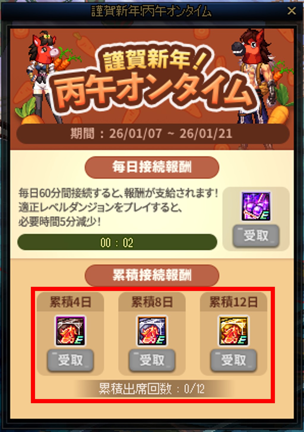 毎日接続報酬を獲得すると、累積出席回数が1増加し、累積接続回数が4、8、12回を達成する毎に累積接続報酬を獲得することができます。
