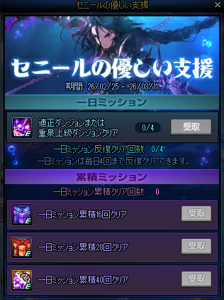 | 適正ダンジョンまたは重泉上級ダンジョンを4回クリア (1日最大4回反復可能) |