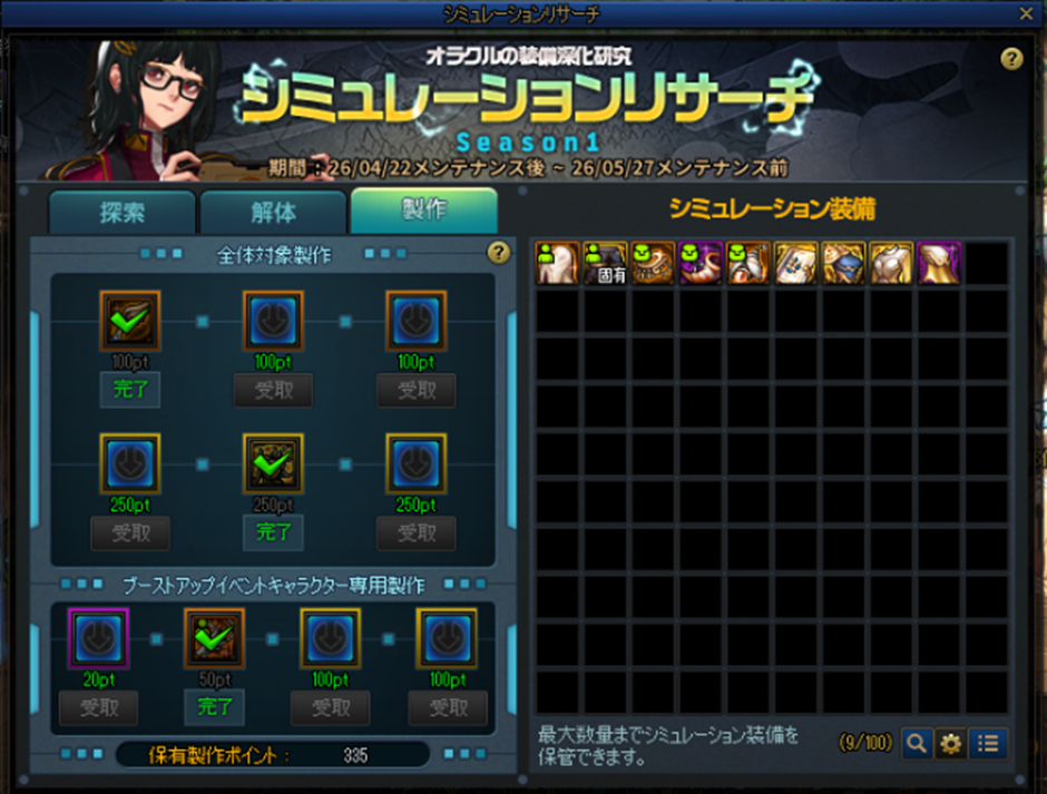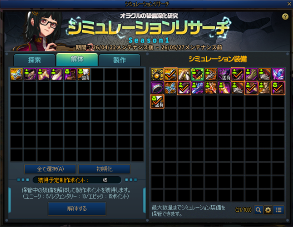 ※各シーズンの終了時、装備製作回数とシミュレーション装備は初期化されます。