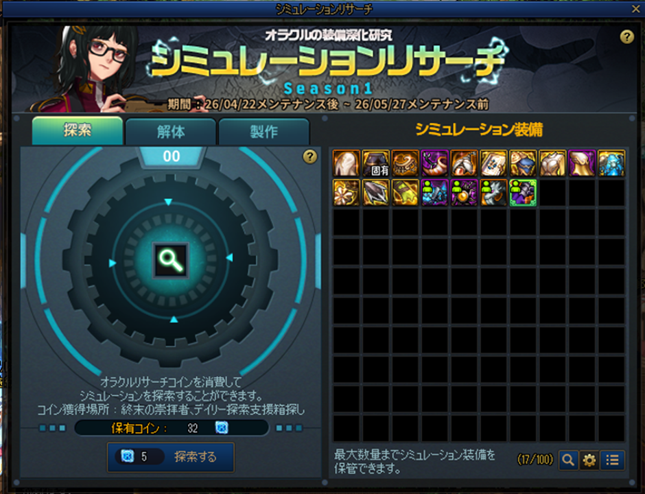 オラクルリサーチコインを使用し、決められた確率に応じてユニーク~エピック装備を探索しましょう。