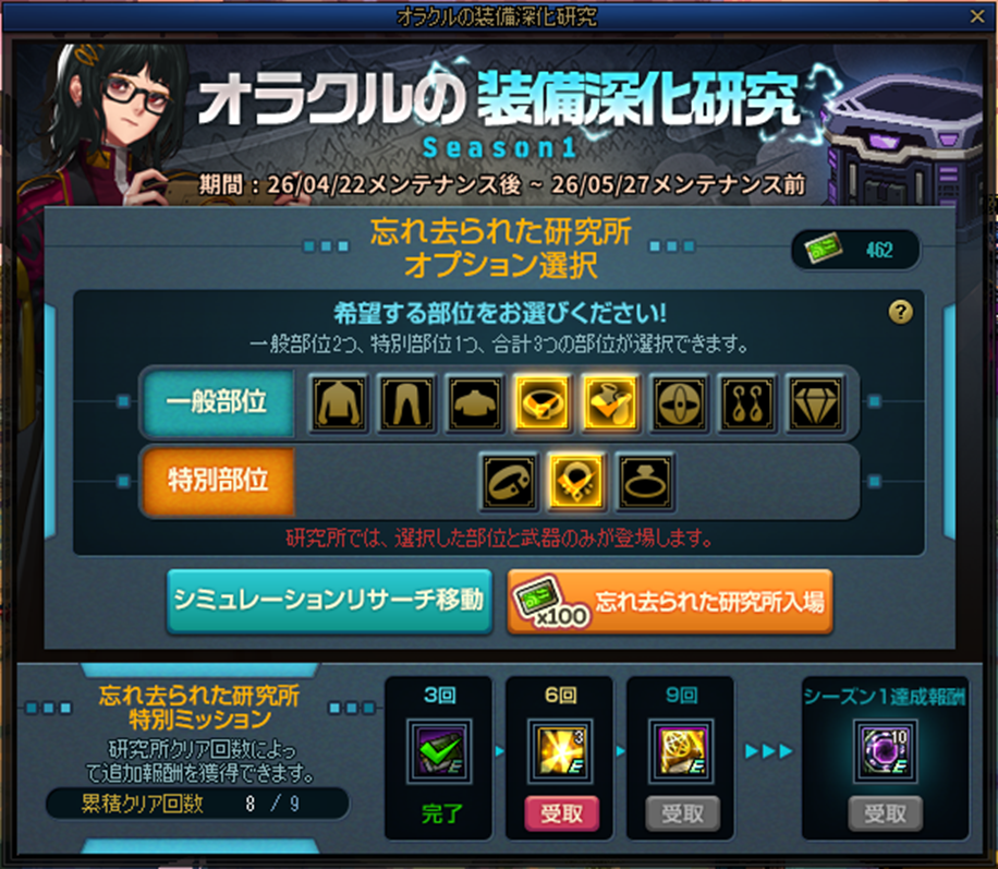 ダンジョン入場前に好きな部位を最大3種類(一般部位を2種類、アクセサリーを1種類)選択し、研究所の遺産追跡装置100個を使って忘れ去られた研究所に入場します。