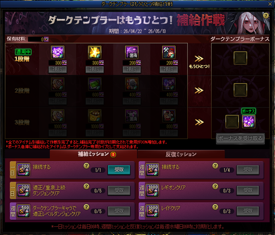 5.ダークテンプラーボーナス補給品まで全て受け取ると、再び段階ごとの補給品を獲得できるようになります。