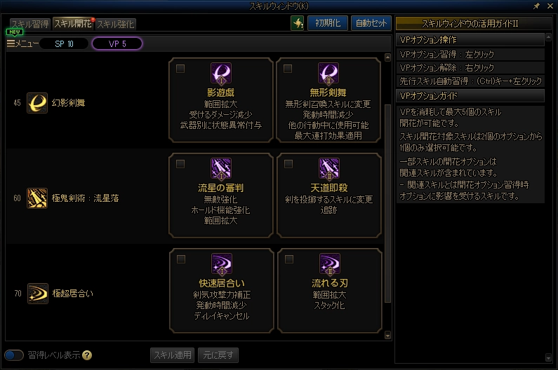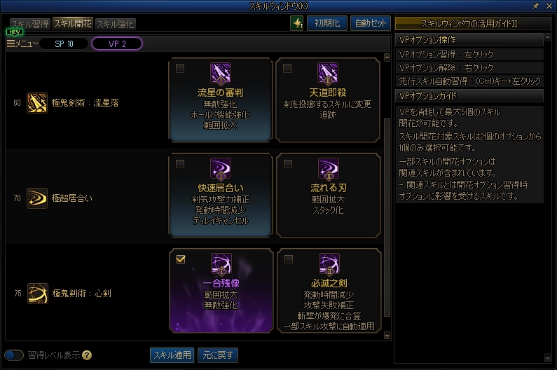 VPオプションガイド スキル開花オプションシステムに関する機能をガイドします。 |