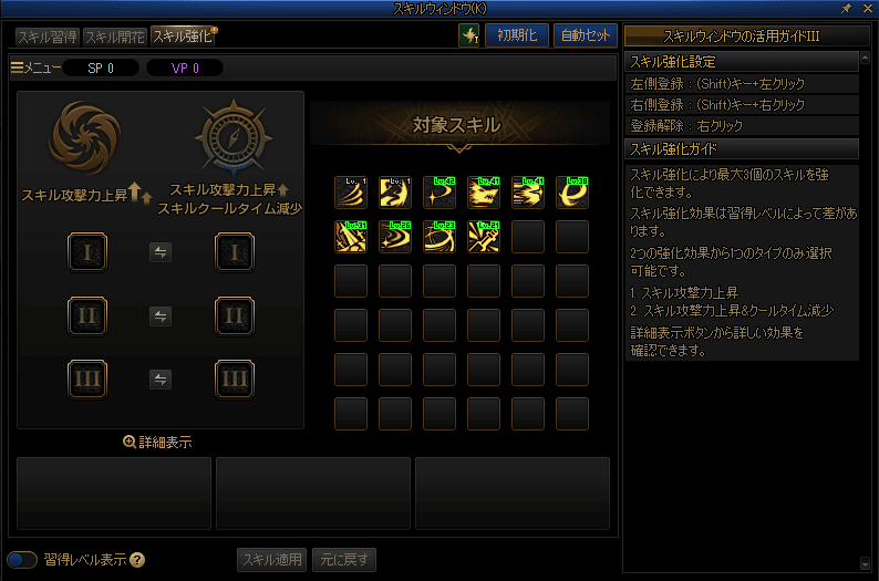 - スキルウィンドウから「スキル強化」タブを選択すると利用できます。