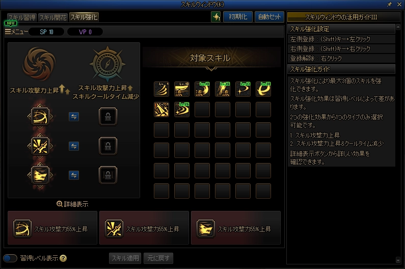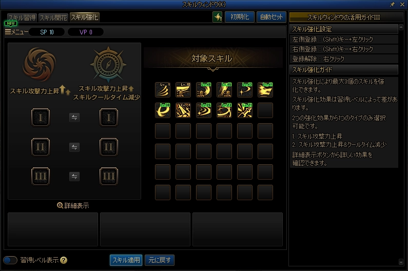 スキル強化設定 スキル強化設定操作に関する機能をガイドします。 スキル強化タブではガイド画面が固定されます。 |