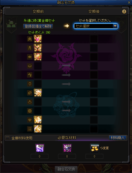 ・交換したいセットを選択してセット融合石を一括で交換できる機能に変更されます。