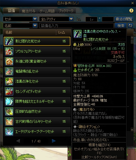 - 百科事典でセットをブックマークした場合、そのセットの全ての部位にドロップ後、エフェクト効果が適用されます。