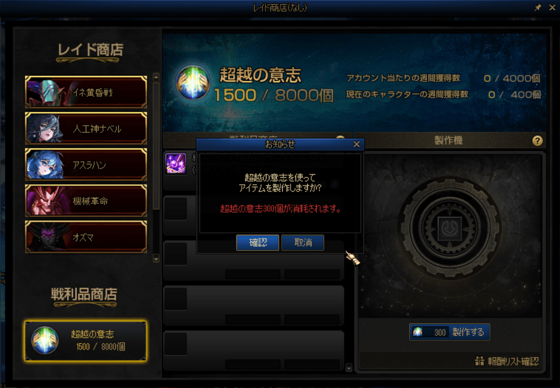 ・「製作する」は週に最大5回まで可能で、製作を行うたびに次の製作に必要な超越の意志の数が増加します。